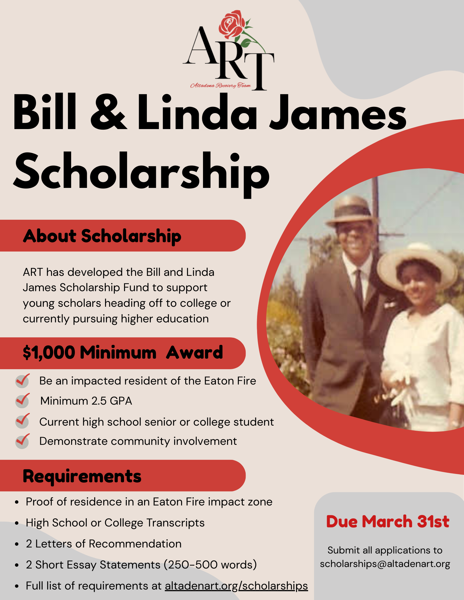 *Funds for the Bill and Linda James Scholarship were secured independently through ART’s general scholarship program. This scholarship is administered by ART in accordance with its established criteria and conflict-of-interest policies. Recipient selection is conducted through a double-blind review process. With the exception of ART’s CEO, who serves as a non-voting member of the selection committee, no family members participate in applicant review or award decisions.